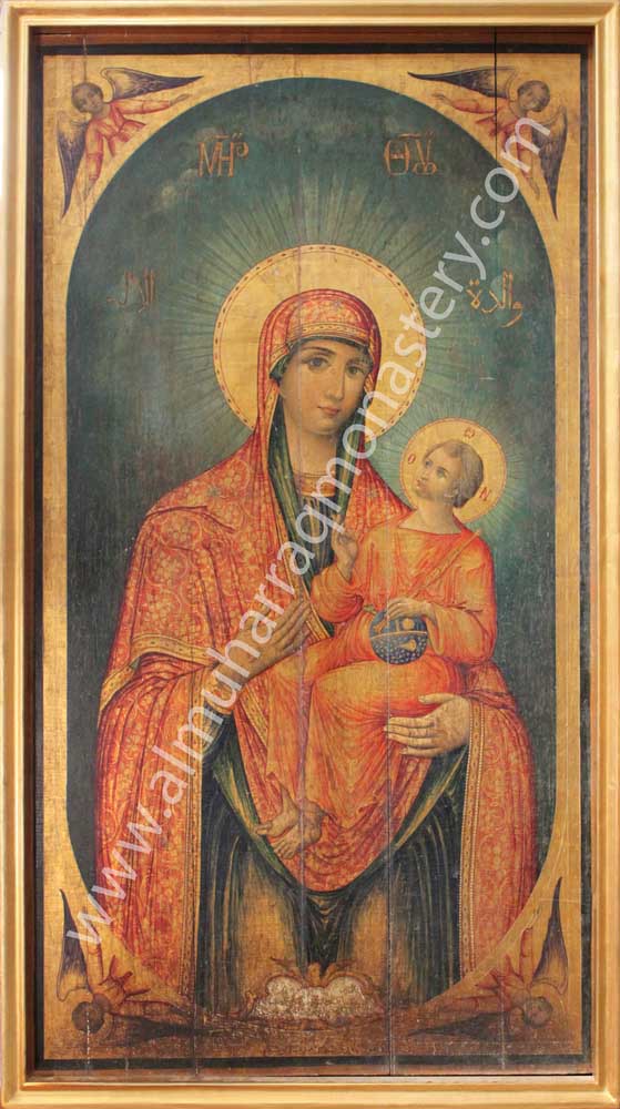وفي الطريق قابله بعض الفرسان السكارى وقد أفقدتهم الخمر وعيهم حتى أنهم إصطدموا أثناء سيرهم بأحد الجدران فلما شاهدهم الشاب إرتبك ووقع في بئر جاف خالي من المياه ومات ومضت فتره طويلة من الزمن ولم يرجع الشاب فانزعجت أمه لغيابه وخرجت لتبحث عنه وأثناء خروجها للبحث سقطت الأم في ذلك البئر الذي سقط فيه إبنها ميتاً. ولما رأته على هذه الحالة صرخت متشفعة بالسيدة العذراء أن تقيم إبنها من الموت. فأستجابت السيدة العذراء أم النور وأمرت ملاكين أن يناديا باسم الشاب، ولما سمع الشاب إسمه قام لوقته وكأنه كان نائماً. ففرحت الأم جداً ومجدت أسم الرب القدوس القادر على كل شئ والصانع العجائب بشفاعة أمه العذراء. وعادوا إلى منزلهم وهناك وجدوا البيت ملآن بكل الخيرات... ولما اطمأن الشاب على أمه تركها وجاء إلى الدير وترهب ثم صار رئيسا للدير.